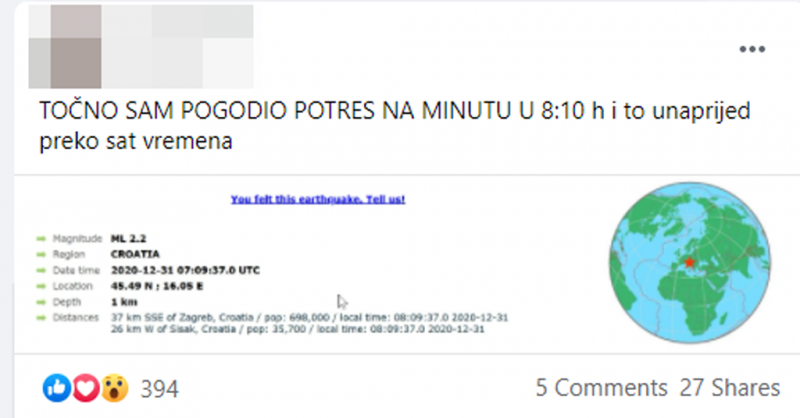 Kriminalističkim istraživanjem je utvrđeno da je osumnjičeni od 28. prosinca do danas putem društvene mreže te mreže za objavu i razmjenu videozapisa uporno objavljivao lažne i uznemirujuće vijesti i sadržaje o potresima. Objavljivao je kada će se naredne godine i u kojim mjestima u Hrvatskoj dogoditi potresi te najavljivao nove snimke i predviđanja.
