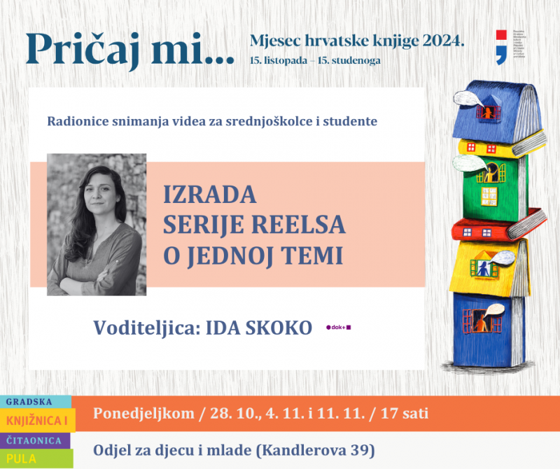 Radionice snimanja videa: Izrada serije Reelsa o jednoj temi održat će Ida Skoko na Odjelu za djecu i mlade Gradske knjižnice i čitaonice Pula u Mjesecu hrvatske knjige.