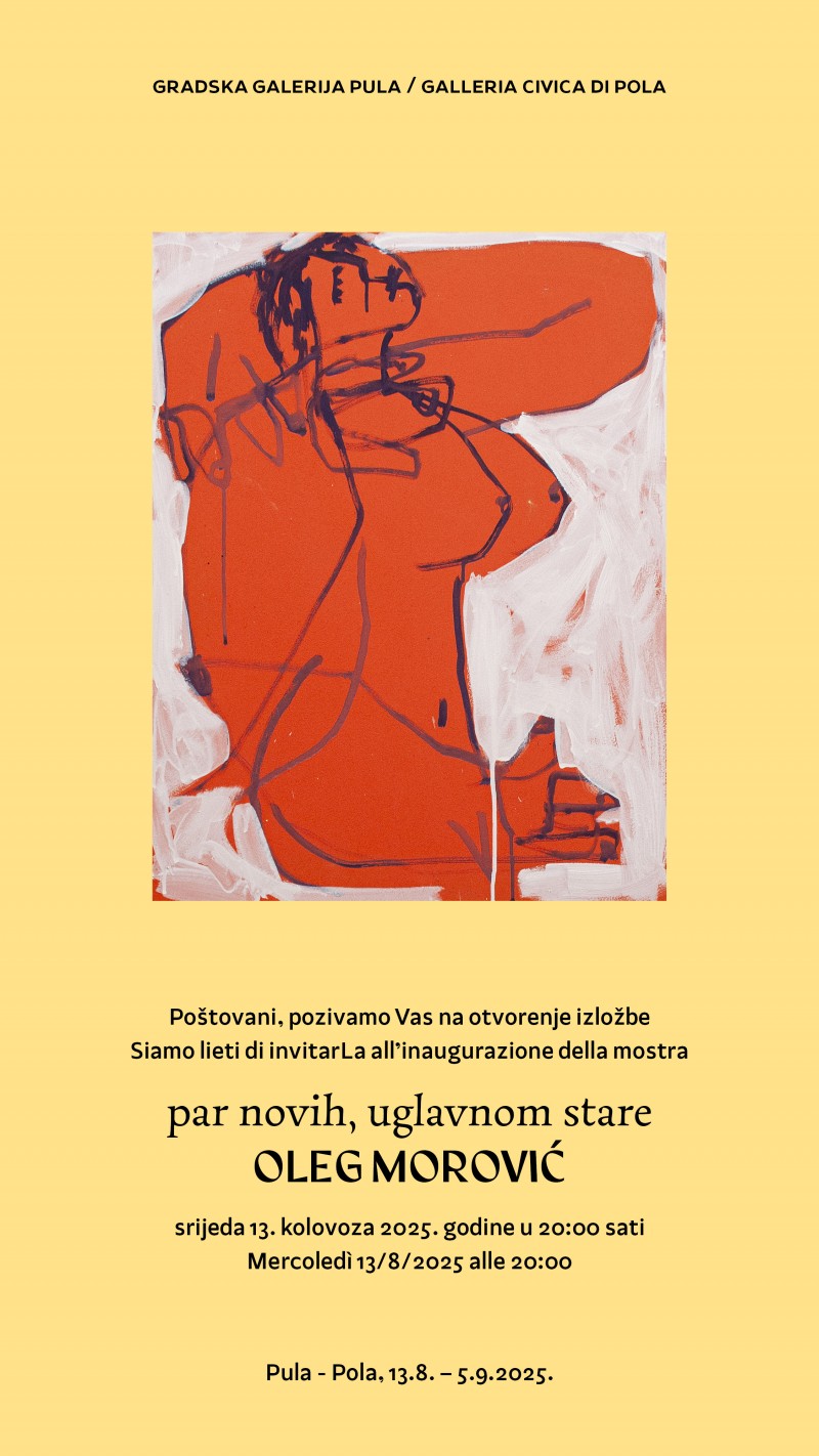 Zadovoljstvo nam je pozvati vas na otvorenje izložbe Olega Morovića; Gradska Galerija Pula, Kandlerova 8, u srijedu 13.8. od 20 sati. Ovu zanimljivu izložbu predstaviti će Mladen Lučić-Luc, kustos izložbe.