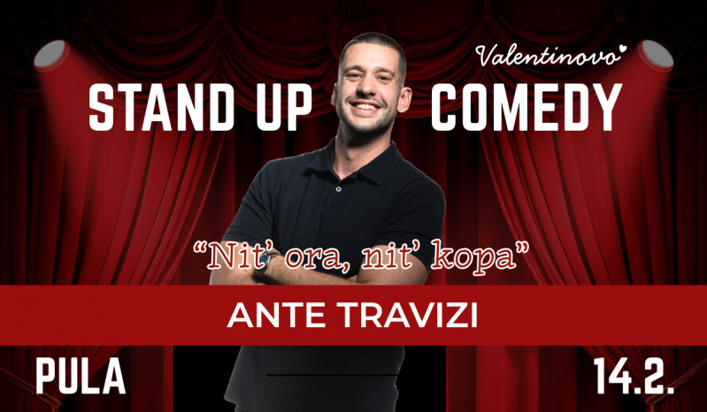 Ako vam je dosta romantičnih klišeja, Pula ove godine za Valentinovo nudi nešto puno bolje: smijeh do suza! Na Dan zaljubljenih u Pulu stiže Ante Travizi sa svojim stand-up showom kojim slavi 10 godina karijere „Nit' ora, nit' kopa“. Večer je rezervirana za brutalno iskren humor, životne apsurde i situacije u kojima će se pronaći svi.