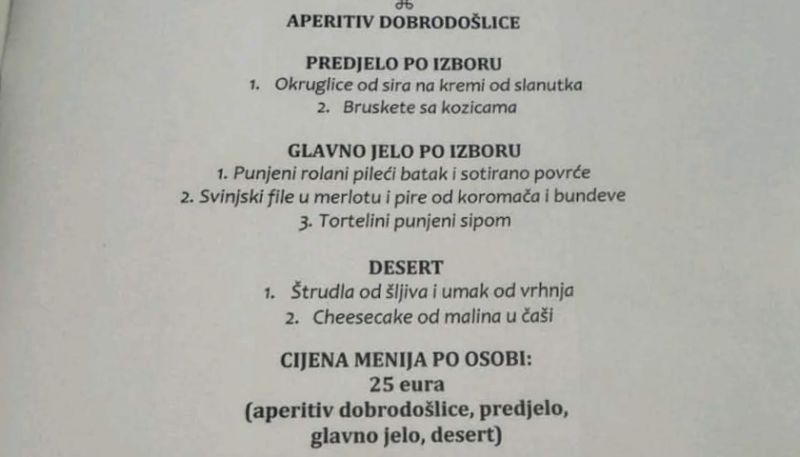 Cijena kompletnog menija iznosi 25 eura po osobi, a uključuje aperitiv, predjelo, glavno jelo i desert.