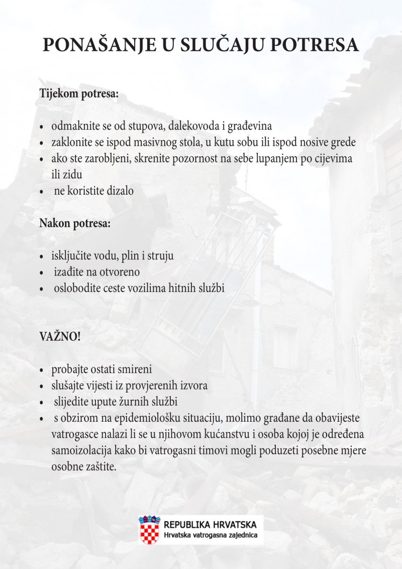 - Ukoliko bude potrebe, u ispomoć će biti upućene i snage iz drugih županija. Za sada prema informacijama s terena, nema potrebe za slanjem dodatnih snaga. Vatrogasci na terenu saniraju oštećenja prema prioritetima - rekao je glavni vatrogasni zapovjednik Tucaković te istaknuo da će u ovoj situaciji biti primjenjena sva znanja i iskustva stečena za vrijeme sanacije zagrebačkog potresa.