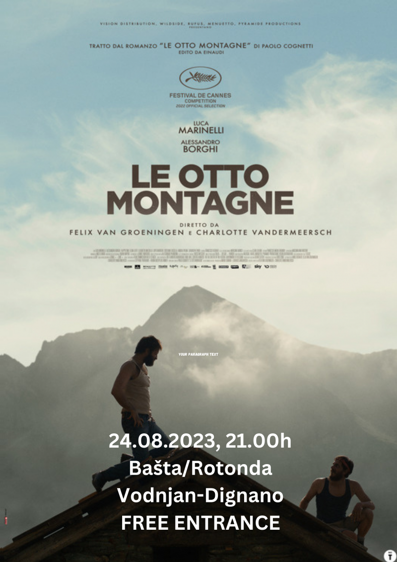 U sklopu Art-kina “Cineast” u organizaciji Pučkog otvorenog učilišta – Università popolare aperta “Vodnjan-Dignano” ovog će četvrtka, s početkom u 21.00 sati, u Bašti u Vodnjanu biti prikazan i posljednji ovogodišnji film. Radi se o drami “Osam planina” redatelja Felixa van Groeningena i Charlotte Vandermeersch.