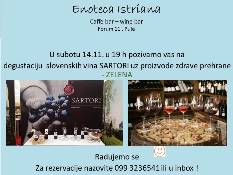 U subotu, 14. studenog u 19 sati u prostorima Enotece Istriane u Puli, na Forumu degustirati će se Sartori vina iz Slovenije uz proizvode zdrave prehrane 'Zelena'. Za rezervacije nazovite 099 323 6541 ili se javite u inbox. (rex)