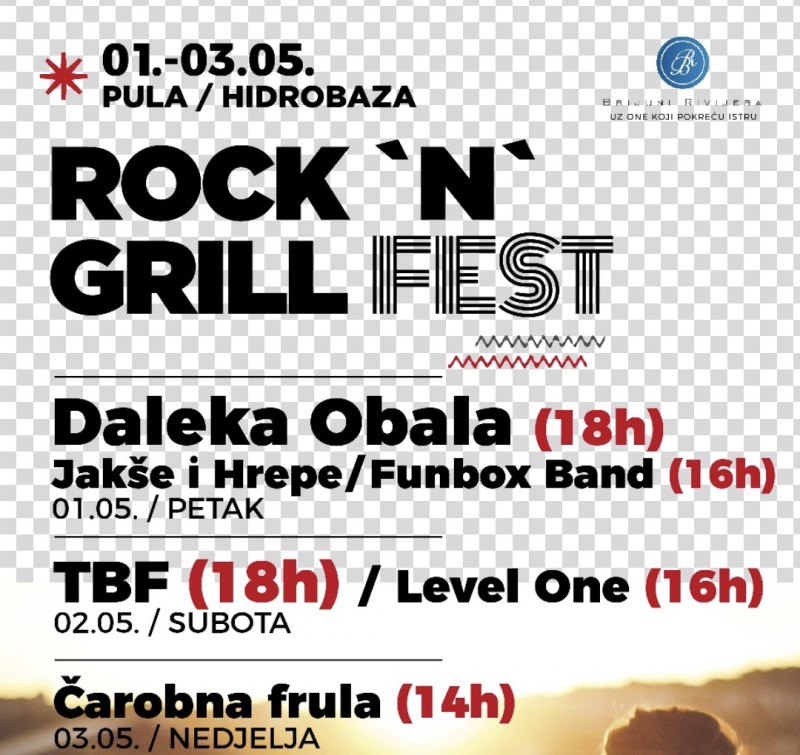 Povodom obilježavanja Dana grada Pule i Praznika rada, od 1. do 3. svibnja na Hidrobazi vas očekuje Rock ‘n’ Grill Fest – tri dana opuštenog druženja uz more, u ritmu dobre glazbe, mirisa roštilja i proljetnog sunca. Program je osmišljen u dnevnim i popodnevnim satima, idealno za uživanje na otvorenom. Ulaz je besplatan!