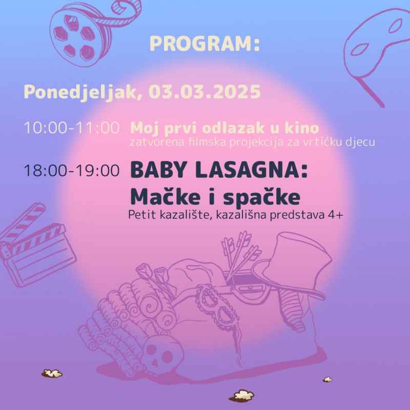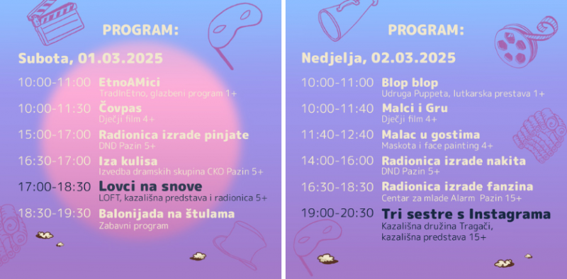 „ZIMSKE PUSTOLOVINE KAZE I FILA“ – prvo je izdanje dječjeg festivala kazališta i filma koji će se održati u organizaciji Centra za kulturu i obrazovanje Pazin u prostorima Spomen doma i koji će trajati od 1. do 3. ožujka 2025. godine.