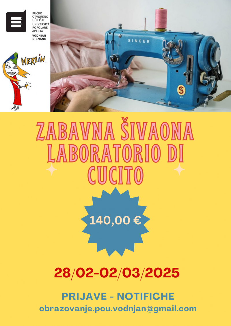 Pučko otvoreno učilište “Vodnjan-Dignano”, u suradnji s Udrugom za promicanje kreativnosti “Merlin”, organizira zabavnu šivaonu u trajanju od 14 sati. Tečaj će se održati kroz 3 dana, od petka, 28. veljače do nedjelje, 2. ožujka 2025. u prostorima Učilišta na adresi Portarol 31, Vodnjan. Cijena je 140,00 €.