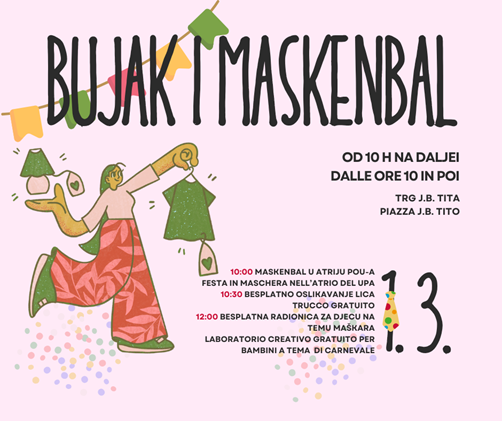 Radionica za djecu na temu maškara – održava se u 12:00 sati za djecu od 7 do 12 godina. Sudjelovanje je besplatno, ali broj mjesta je ograničen, pa su prijave obavezne na info@uciliste-buje.eu.