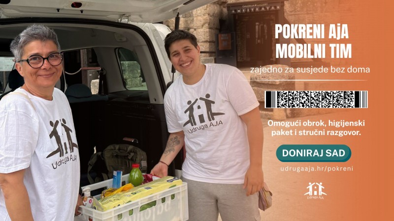 Mobilni tim Udruge AjA svakodnevno dolazi do ljudi do kojih sustav često ne dopire – pruža im podršku na terenu dostavom hrane i higijenskih potrepština, povezuje ih s pravima i uslugama te im vraća osjećaj sigurnosti i dostojanstva. Trenutno pokrivaju potrebe 40ak osoba, a žele proširiti uslugu na još 100 ljudi u potrebi diljem Istre. Kampanja traje naredna dva mjeseca, s ciljem prikupljanja 30.000 eura, koliko je potrebno za jednogodišnje proširenje usluge mobilnoga tima.