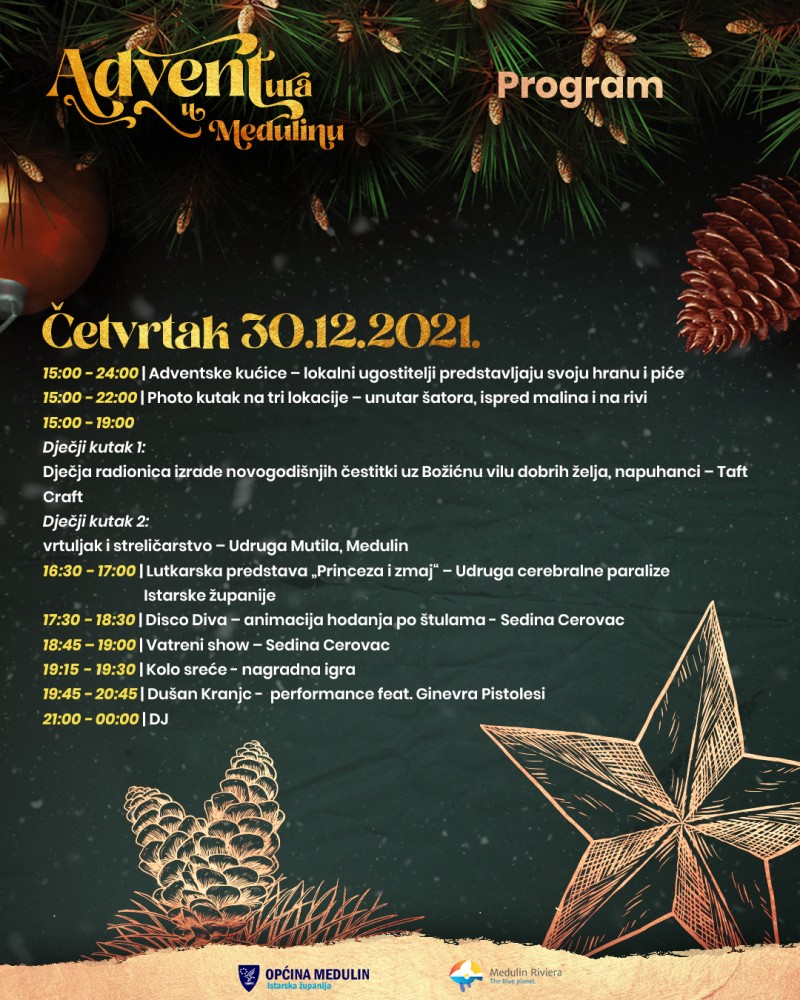 Završnica prve medulinske ADVENTure vas očekuje u četvrtak od 15 do 24 sata, a u petak – na Silvestrovo u dnevnom terminu, od 10 do 15 sati.