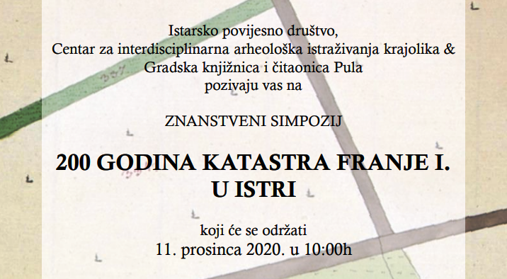 U petak, 11. prosinca u 10 sati održat će se virtualni znanstveni simpozij 200 godina Katastra Franje I. u Istri. Organizatori su Istarsko povijesno društvo, Centar za interdisciplinarna arheološka istraživanja krajolika i Gradska knjižnica i čitaonica Pula.